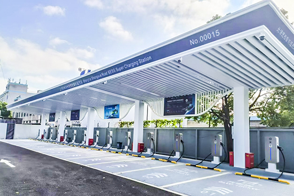 作為城市分布式儲能的示范應(yīng)用案例,上海尚學(xué)路光儲充檢超級充電站配備了127.6kWp分布式光伏板、3296kWh的儲能系統(tǒng),光伏發(fā)電系統(tǒng)能夠結(jié)合儲能系統(tǒng)、充電系統(tǒng),實現(xiàn)光、儲、充協(xié)調(diào)運用,提升清潔能源的消納利用。場站的儲能系統(tǒng)還可以在谷電時段優(yōu)先儲存市網(wǎng)價優(yōu)的電能,并在用電峰值時段供充電使用,減輕高峰時段的電網(wǎng)負(fù)荷、實現(xiàn)削峰填谷,既降低充電成本讓利車主,又提升了自身的運營收益,保障場站長期穩(wěn)定運營。由于采用了全直流微網(wǎng)技術(shù),超充站自身相當(dāng)于一個微電網(wǎng),即便多臺車輛高功率同時充電,也不會對公共電網(wǎng)造成供電負(fù)荷,甚至利用儲能系統(tǒng)還能夠參與系統(tǒng)調(diào)頻、調(diào)壓,改善電能質(zhì)量,通過儲充技術(shù)結(jié)合的運用,進一步緩解城市中心區(qū)充電基礎(chǔ)設(shè)施增容、擴容的壓力。
